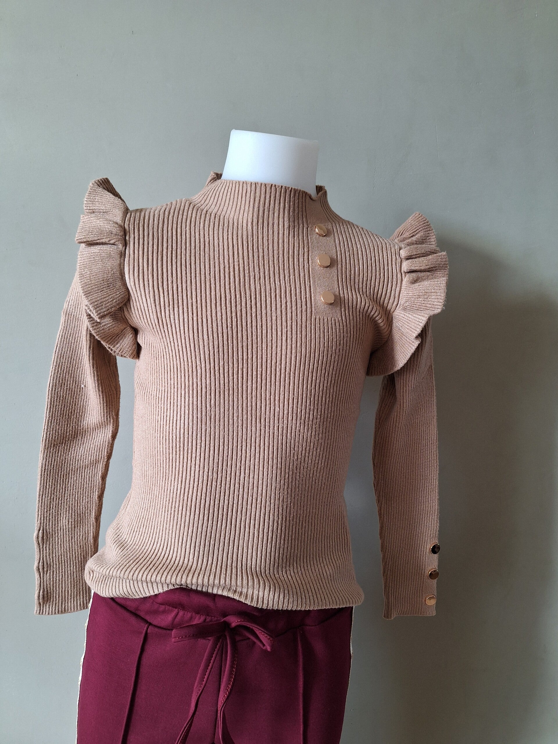 Leuke trui in Camel kleur met Gouden knoop